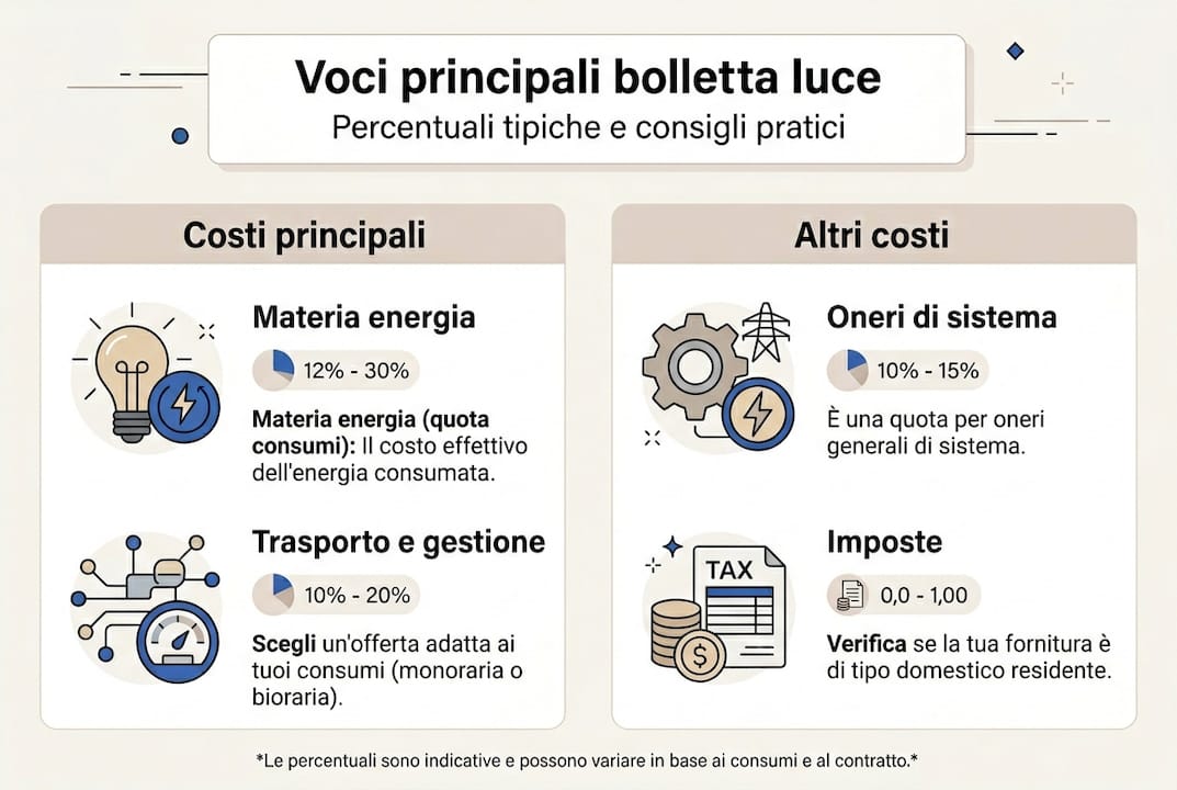 La prima cosa da sapere è che la bolletta non è un blocco monolitico di numeri. È composta da macro-categorie ben distinte, ognuna con un peso specifico sul totale che paghi. Conoscere questa struttura ti permette di capire dove si concentra la spesa e dove puoi intervenire.