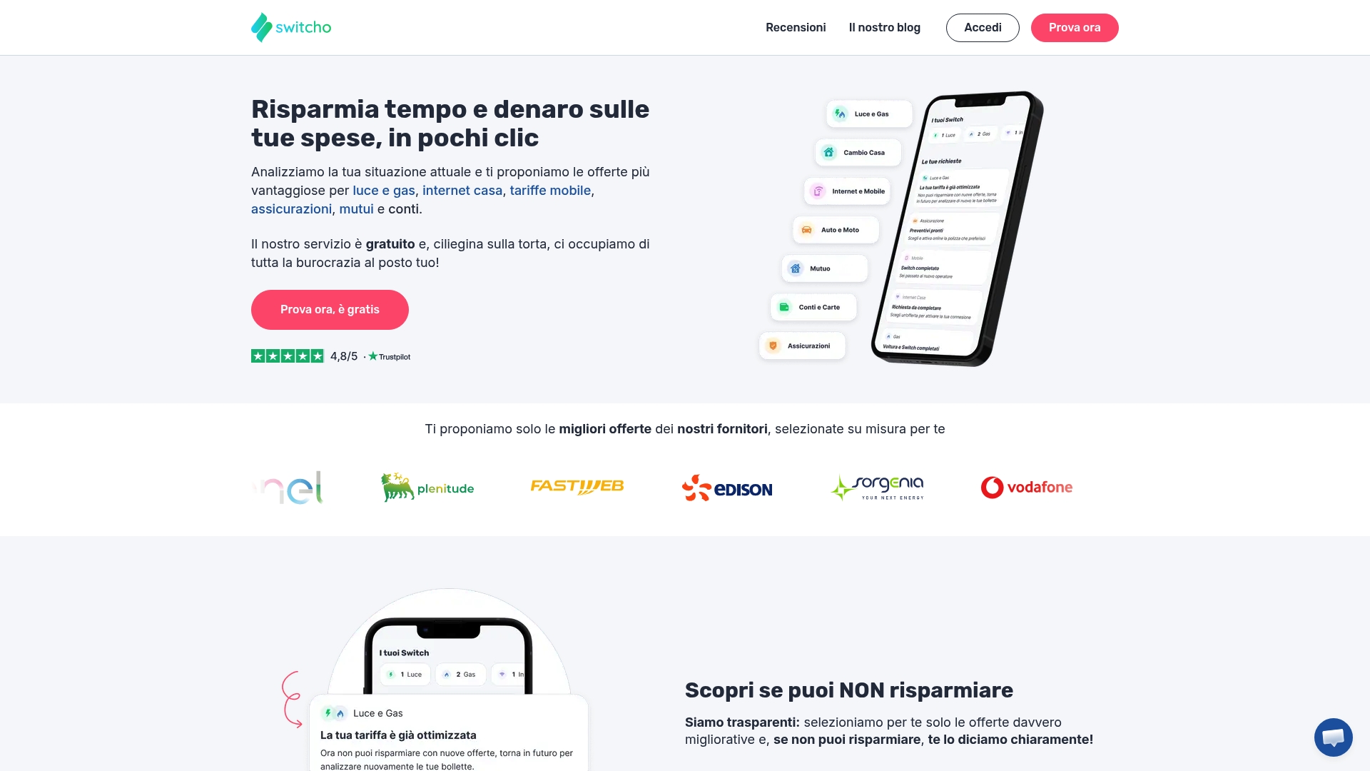 Switcho è un servizio gratuito che confronta luce, gas, internet, mobile, assicurazioni, prestiti e conti correnti e gestisce le pratiche per il cambiamento di fornitore. È pensato per chi vuole risparmiare tempo e denaro senza mucchi di scartoffie.