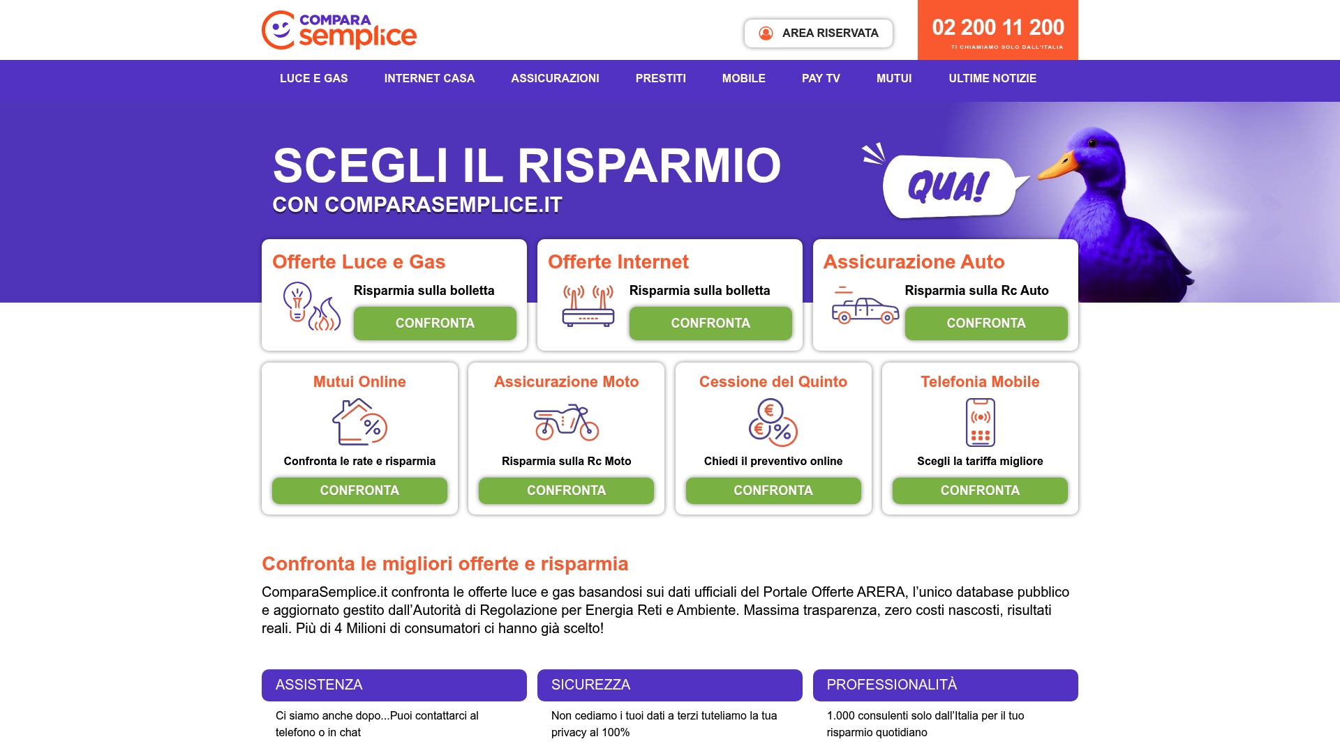 ComparaSemplice.it confronta offerte di energia, internet, assicurazioni, mutui, prestiti, telefonia mobile e pay TV con aggiornamenti giornalieri delle tariffe. Il sito utilizza il database ARERA per energia e gas e mette a disposizione assistenza dedicata sia telefonica che online per accompagnare la scelta.