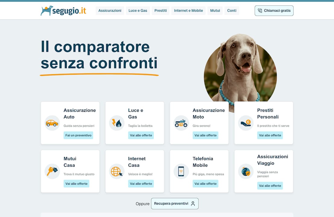 Segugio.it è il comparatore leader in Italia per assicurazioni, tariffe luce e gas, internet, mutui e prestiti. Offre confronti gratuiti e trasparenti supportati da una rete di oltre 130 partner, pensati per risparmiare tempo e denaro.