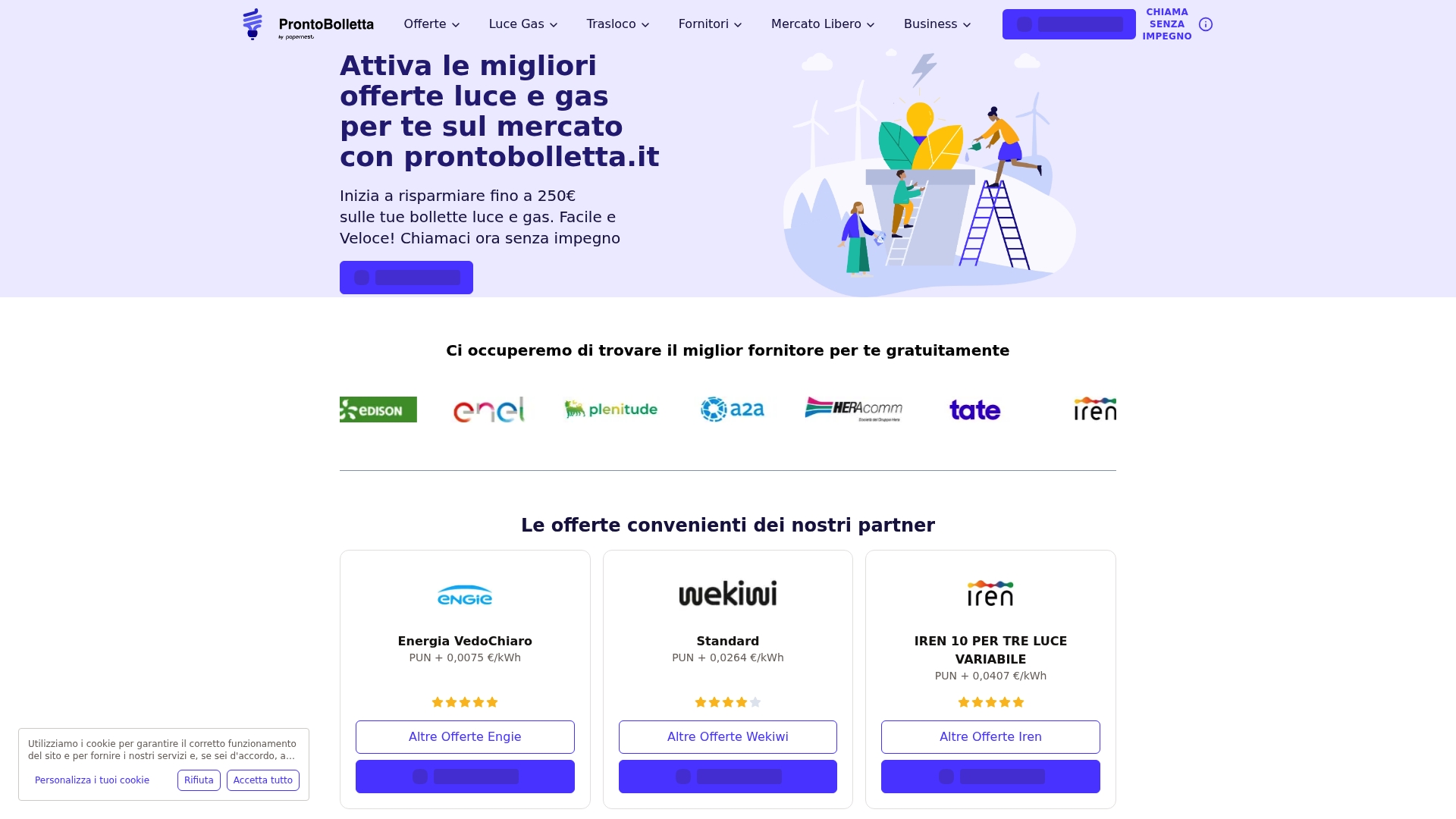 ProntoBolletta mette a disposizione il confronto gratuito di offerte luce e gas e offre assistenza personalizzata per attivazioni e cambi fornitori. Supporta anche chi si trasferisce con servizi di trasloco e gestisce offerte business per aziende e imprese.